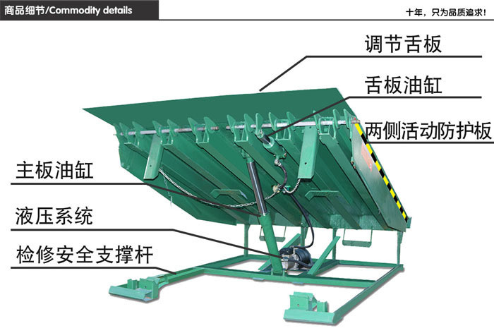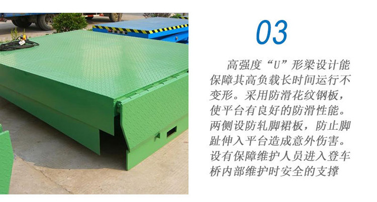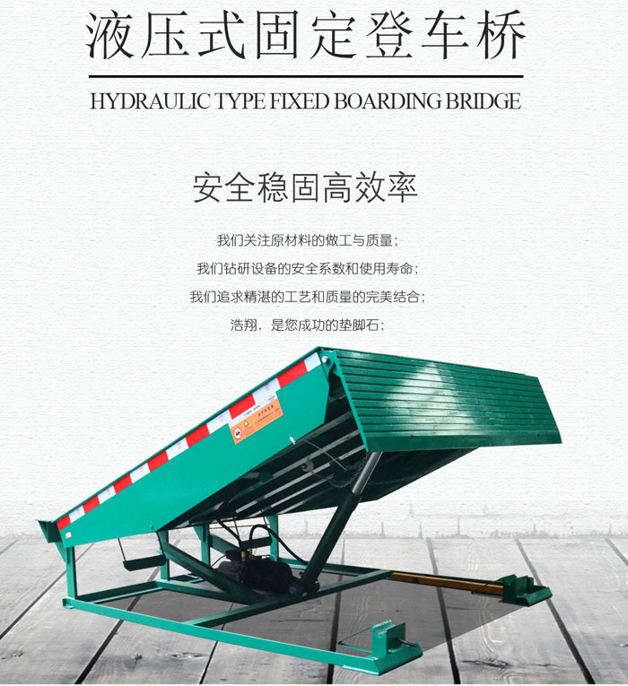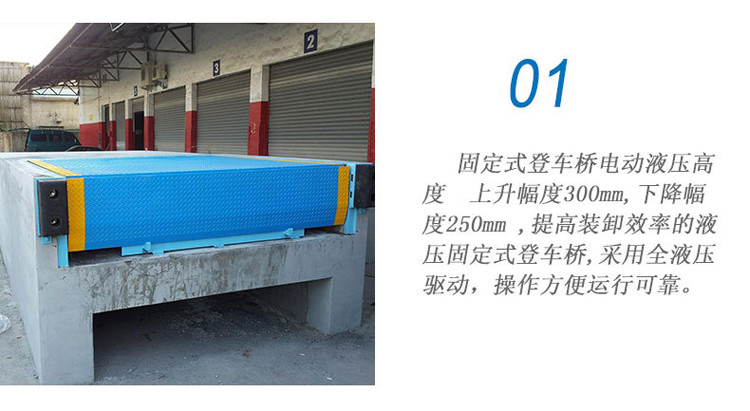 固定式液壓登車橋,又叫做月臺高度調節板,該系列產品廣泛應用于裝卸貨物頻繁的倉儲物流基地,如倉庫、車站、碼頭、郵政運輸、物流配送等場所。該設備與月臺和為一體,在倉庫和車輛之間搭起橋梁,輔助叉車或其他運輸設備裝卸貨物。使用時可根據貨車車廂高度不同任意調節,升降方式分為電動和手動。叉車或其他運輸設備通過橋面駛入車廂內部作業,省時省力,的提高了工作效率。