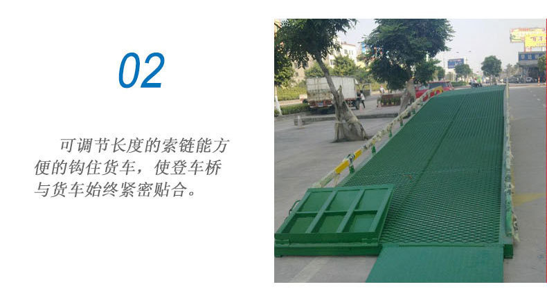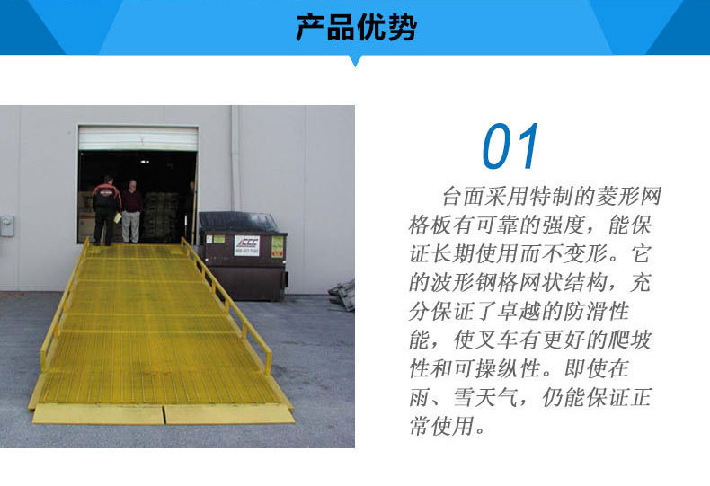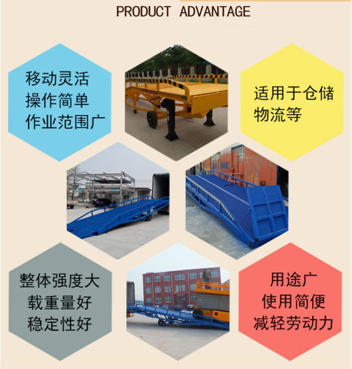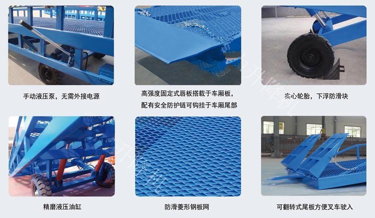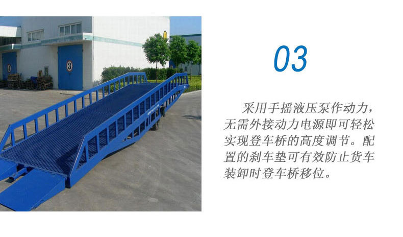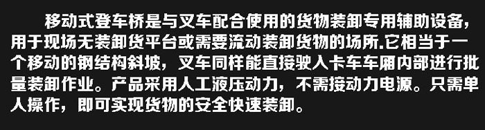 移動式登車橋是與叉車配合使用的貨物裝卸專用輔助設備,用于現場無裝卸貨平臺或需要流動裝卸貨物的場所。它相當于一個移動的鋼結構斜坡,叉車同樣能直接駛入卡車車廂內部進行批量裝卸作業。產品采用人工液壓動力,不需接動力電源。只需單人操作,即可實現貨物的安全快速裝卸。它可使企業減少大量勞動力,成倍提高裝卸作業效率,加快貨物流通速度,獲取更大的經濟效益。