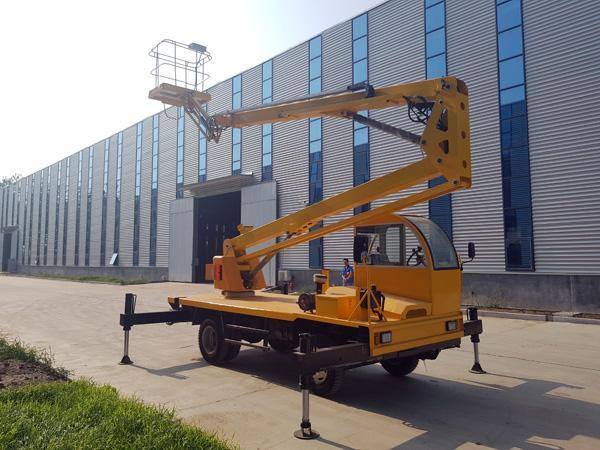 車載折臂式升降機:把曲臂式升降機安裝在汽車上,利用汽車動力驅動升降,適合遠路程的野外高空作業。